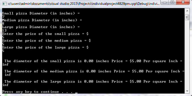 cout << " The diameter of the small pizza is " << smallarea << " inches" " Price = $" << smallprice << " Per square Inch = " << smallinch << endl;