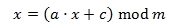 Where x is the current state value, a and c are their respective template parameters, and m is its respective template parameter if this is greater than 0, or numerics_limits<UIntType>::max() plus 1, otherwise.