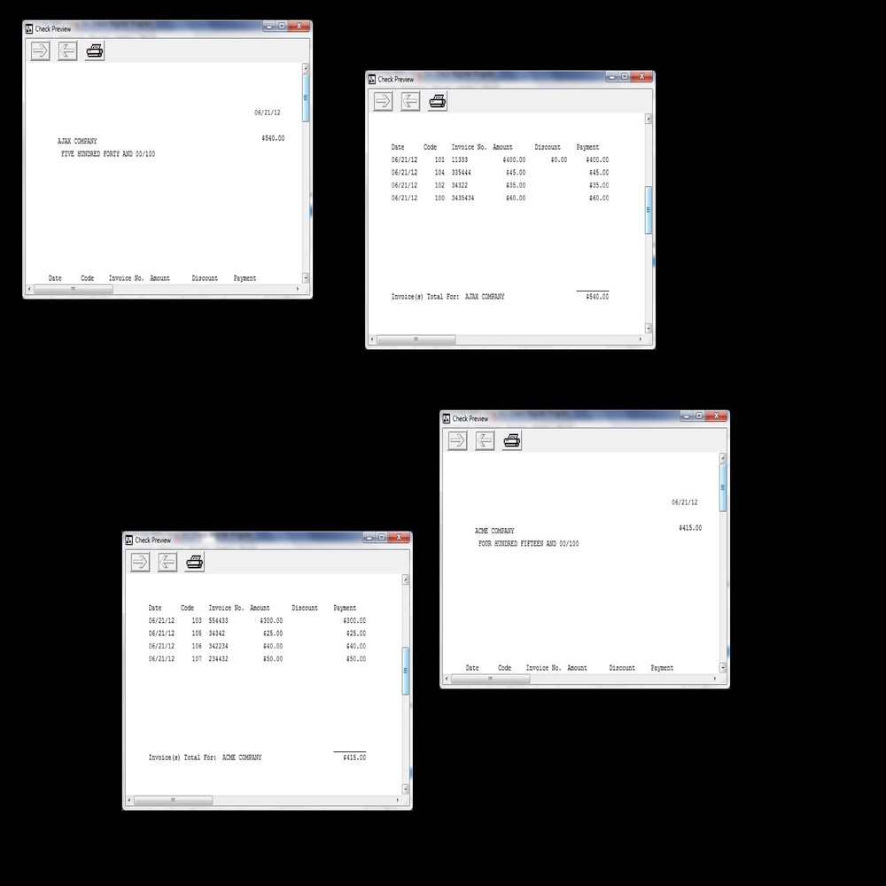 At the beginning of the C++ source code, defined constants are declared so the rest of the code can reference them for various tasks. After clicking the “print check” button, the variables and objects are declared. Next, a simple if-then logic structure is used to test if a check book register record has been selected from the check book register screen. This is necessary because the check number from the check book register screen is needed to help create the printed check. Now initialize the variables for the check and check stub. Next, retrieve the following items from the controls on the currently displayed screen. These items include check number, vendor name, invoice description, check memorandum and paid date.