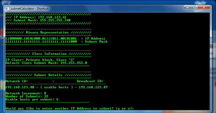 If you want to determine the hosts per subnet for an IP address or see the binary representation of a subnet mask, IP class, and any other subnetting details, then this program will work great for you.