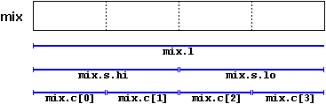 int type with a size of 4 bytes, and a short type of 2 bytes, the union defined above allows the access to the same group of 4 bytes: mix.l, mix.s and mix.c, and which we can use according to how we want to access these bytes: as if they were a single value of type int, or as if they were two values of type short, or as an array of char elements, respectively. The example mixes types, arrays, and structures in the union to demonstrate different ways to access the data. For a little-endian system, this union could be represented as: