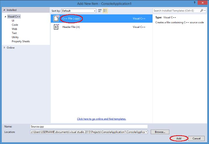 Templates -> Visual C++. Then, on the central part, select Win32 Console Application: