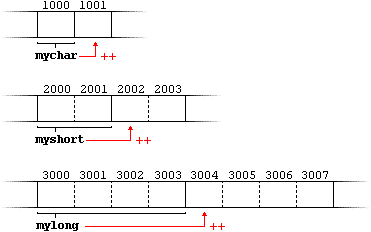 3004, even though they have each been increased only once. The reason is that when adding one to a pointer we are making it to point to the following element of the same type with which it has been defined, and therefore the size in bytes of the type pointed is added to the pointer.